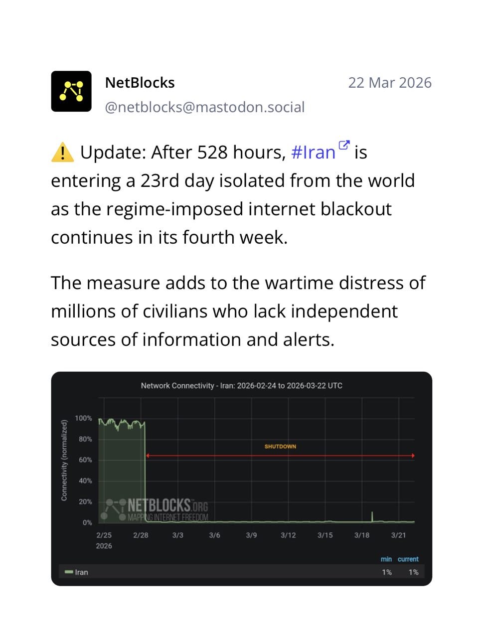 طبق دادههای نتبلاکس، پس از گذشت ۵۲۸ ساعت، قطعی اینترنت در ایران چهارمین هفته خود را سپری میکند و ارتباط مردم با شبکه جهانی اینترنت تقریبا قطع است.