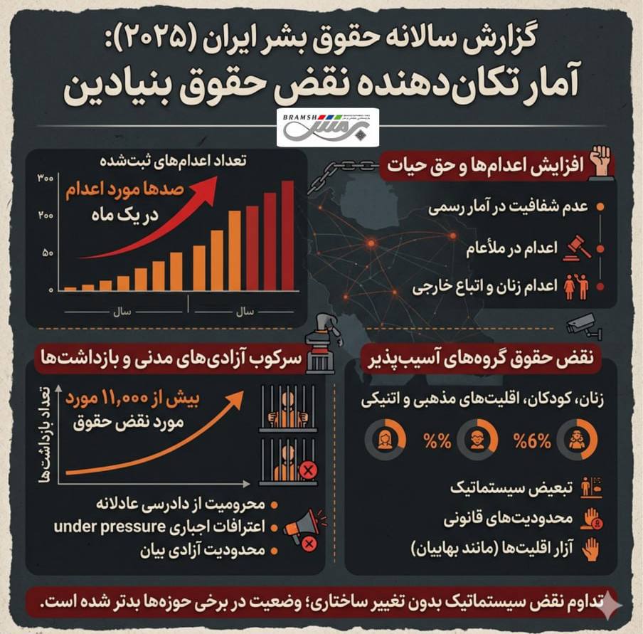 برمش/ گزارش سالانه نهادهای حقوق بشری درباره ایران در سال ۲۰۲۵ نشان میدهد که نقض حقوق بنیادین همچنان در ابعادی گسترده و ساختاری ادامه دارد. این گزارش بر پایه بیش از ۱۱ هزار مورد ثبتشده از نقض حقوق بشر تهیه شده که از دهها منبع مختلف گردآوری شدهاند و تصویری کموبیش دقیق از وضعیت موجود ارائه میدهند. این حجم از دادهها نشان میدهد که مسئله صرفاً چند مورد پراکنده نیست، بلکه با یک الگوی سیستماتیک مواجه هستیم.